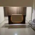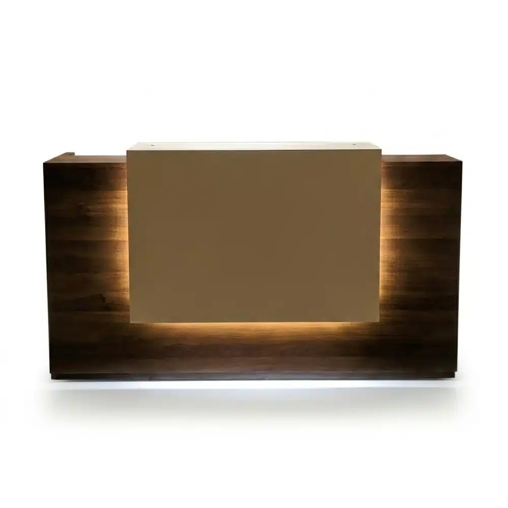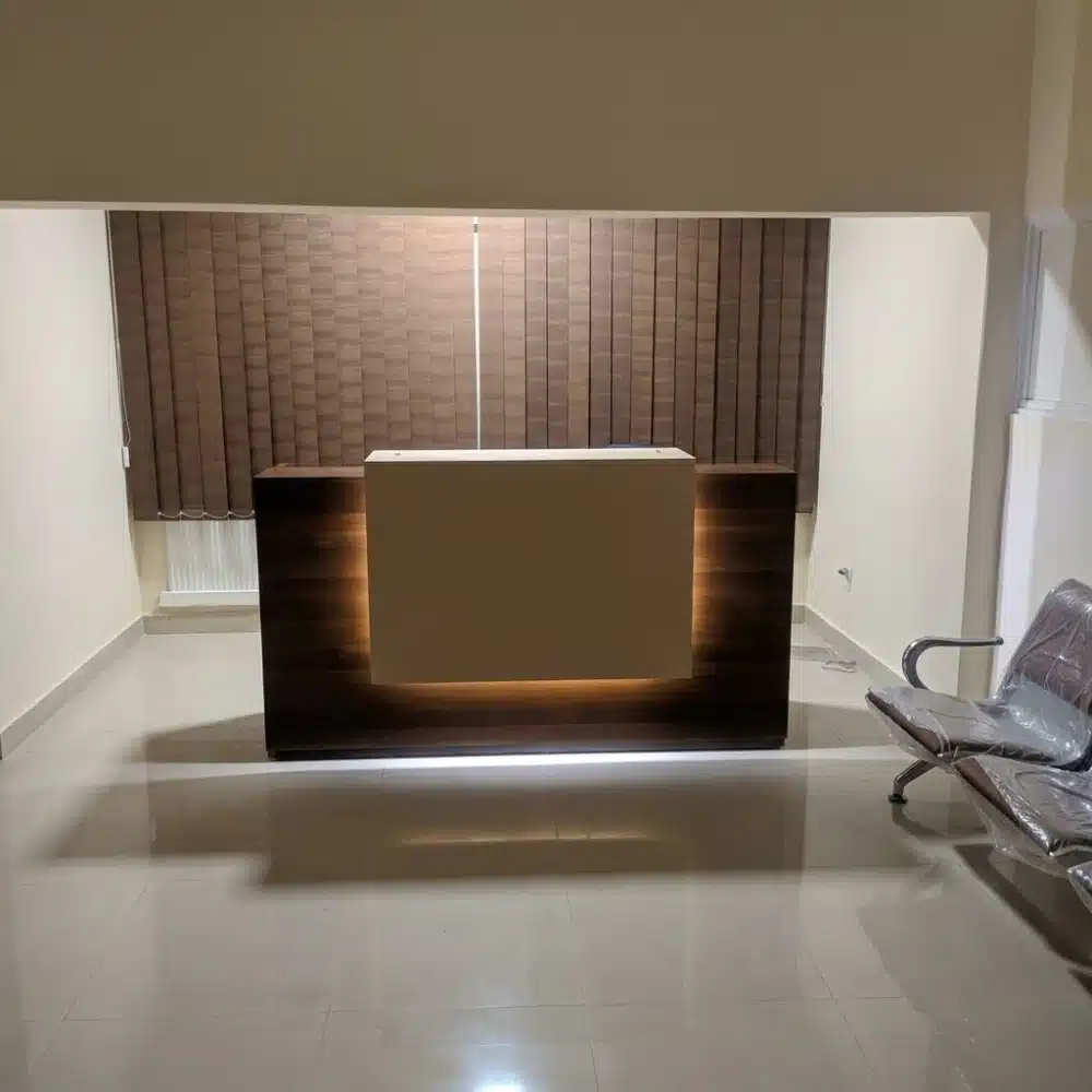 Spanish wood acrylic counter, 240 × 120 cm, modern and luxurious design with a glossy acrylic front and durable material. It provides a comfortable workspace and a professional look, suitable for companies and reception areas.