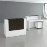 A modern and practical counter designed for reception areas and companies, providing a comfortable workspace with a 3-drawer unit for organized storage of documents and tools. Made from high-quality Spanish wood.