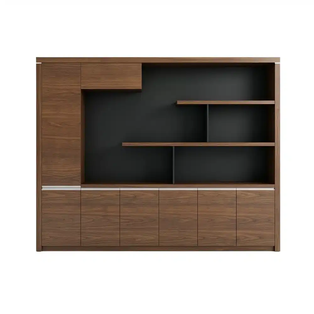 مكتب مدير عملي بتصميم أنيق يوفر مساحة واسعة للعمل مع سايد جانبي لتنظيم الملفات، بالإضافة إلى مكتبة كبيرة تساعد على ترتيب الكتب والأوراق بشكل منظم، ليمنحك بيئة عمل متكاملة ومظهرًا احترافيًا مناسبًا للمكاتب الإدارية.