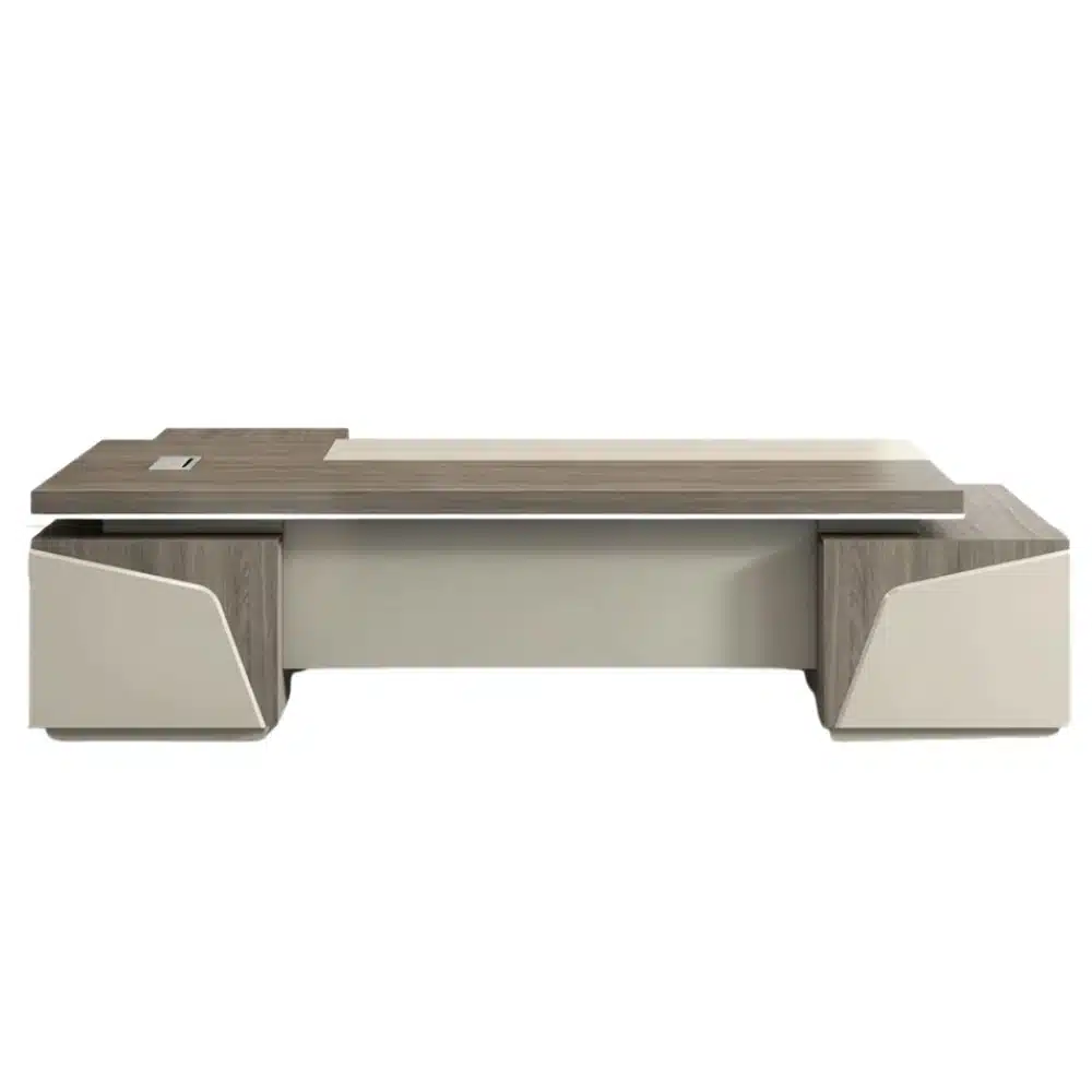مكتب مدير خشب إسباني مقاس 220 × 85 سم مع سايد جانبي، عملي وأنيق، يوفر مساحة واسعة لتنظيم الكمبيوتر والملفات، مصنوع من خشب متين لضمان الثبات والمتانة، مناسب للمكاتب الإدارية والشركات وغرف العمل.