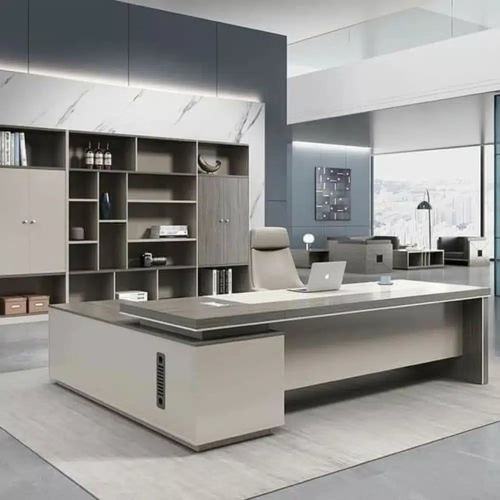 مكتب مدير بتصميم عملي وأنيق يوفر مساحة واسعة للعمل وتنظيم الملفات والأدوات بسهولة، مصنوع من خشب MDF إسباني عالي الجودة ليجمع بين المتانة والمظهر الاحترافي المناسب للمكاتب الإدارية.