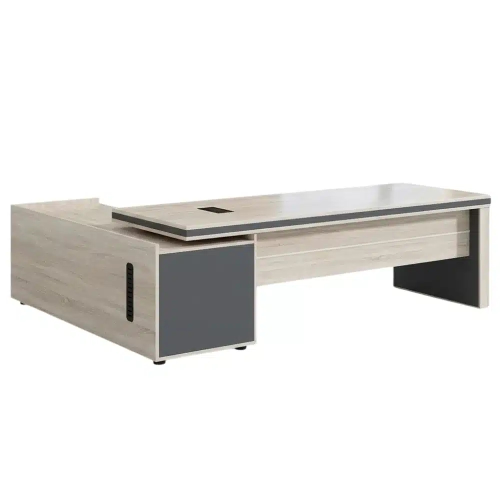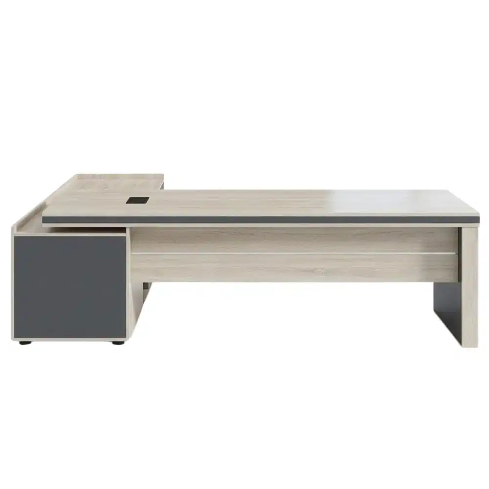 مكتب مدير خشب أكريليك مقاس 220 × 85 سم مع سايد جانبي، عصري وأنيق، يوفر مساحة واسعة للعمل مع تنظيم الملفات والأدوات بسهولة، مصنوع من خامة متينة ولامعة سهلة التنظيف، مناسب للمكاتب الإدارية والشركات وغرف العمل.