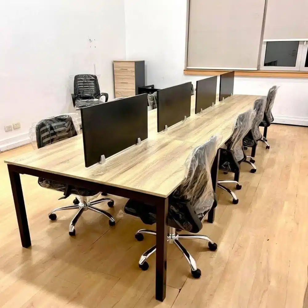 وحدة عمل جماعية بتصميم عملي ومودرن، مناسبة للمكاتب والشركات، بتوفر مساحة عمل مريحة حتى 8 أفراد مع توزيع منظم للمساحات، ومصنوعة من خشب إسباني عالي الجودة مع هيكل حديد قوي لضمان الثبات والمتانة.